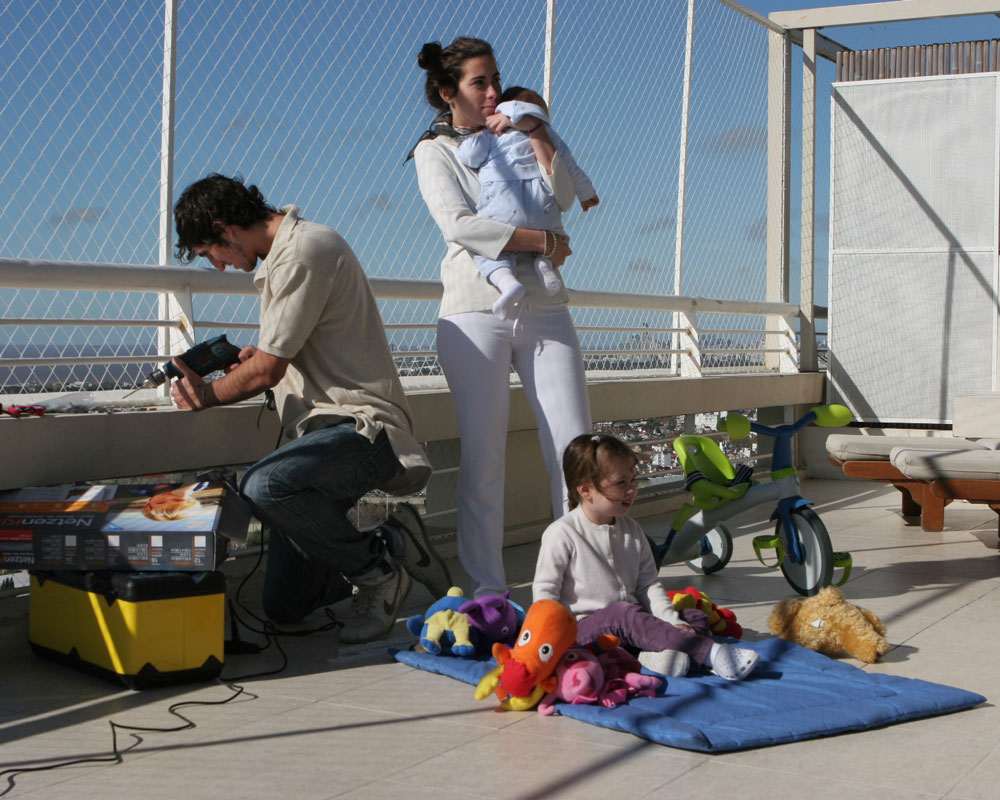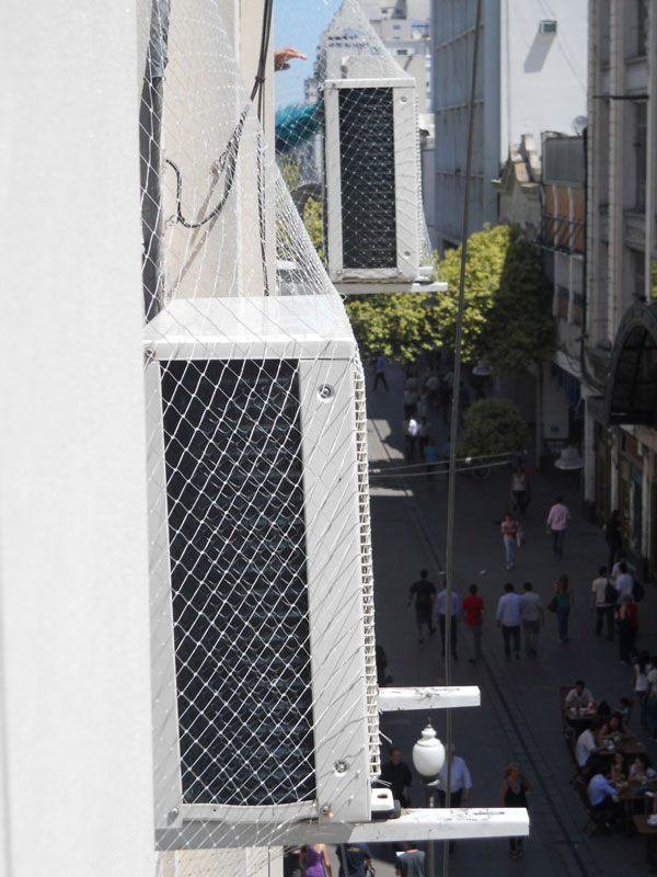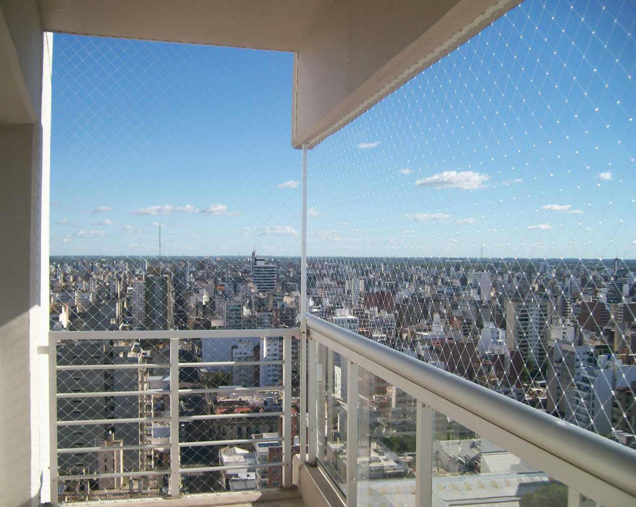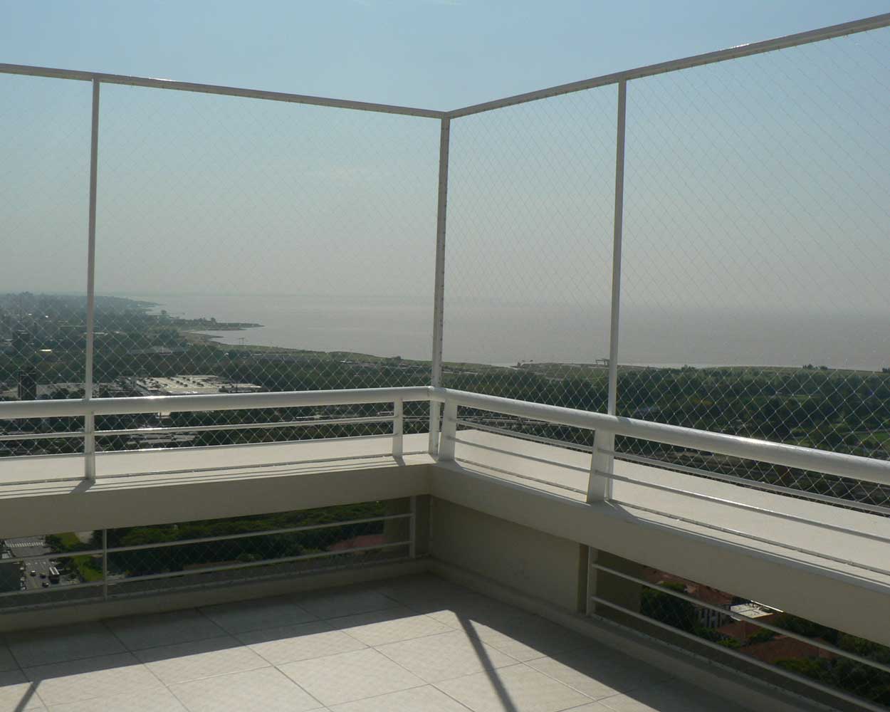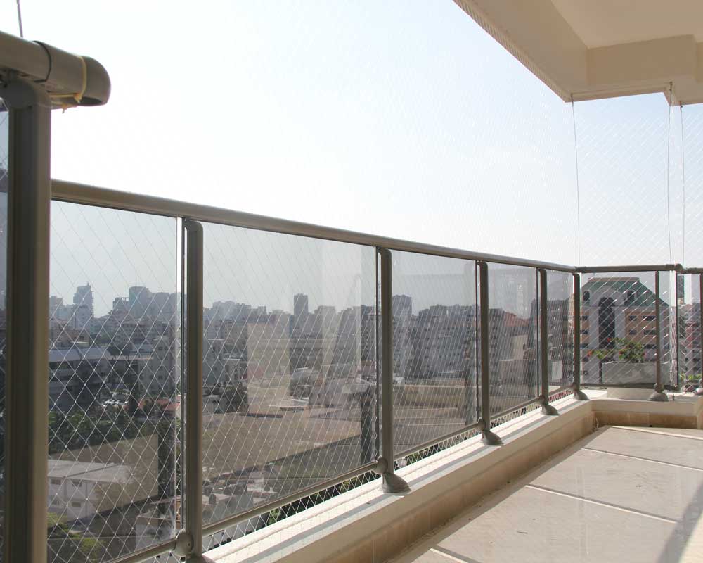 Balkoni in terase so ponavadi mesto, kjer zaščitno mrežo montiramo najlažje. Pomembno je, da z mrežo zaščitimo oz. pokrijemo celotno odprtino. V primeru, da ima balkon ograjo, lahko zaščito montiramo tudi od vrha ograje do stropa. Da bi se izognili vrtanju, lahko nosilne profile pritrdimo na ograjo s pomočjo debelejših plastičnih/kovinskih vezic. Tudi v primeru, da je balkon "L" ali "U" oblike, mrežo montiramo v enem kosu. Ker se mreža v kotih upogne navznoter, na vogalih dodatno montiramo vrv, ki drži vogal mreže in ne vpliva na varnost. Vrv za vogal je sestavni del paketa.