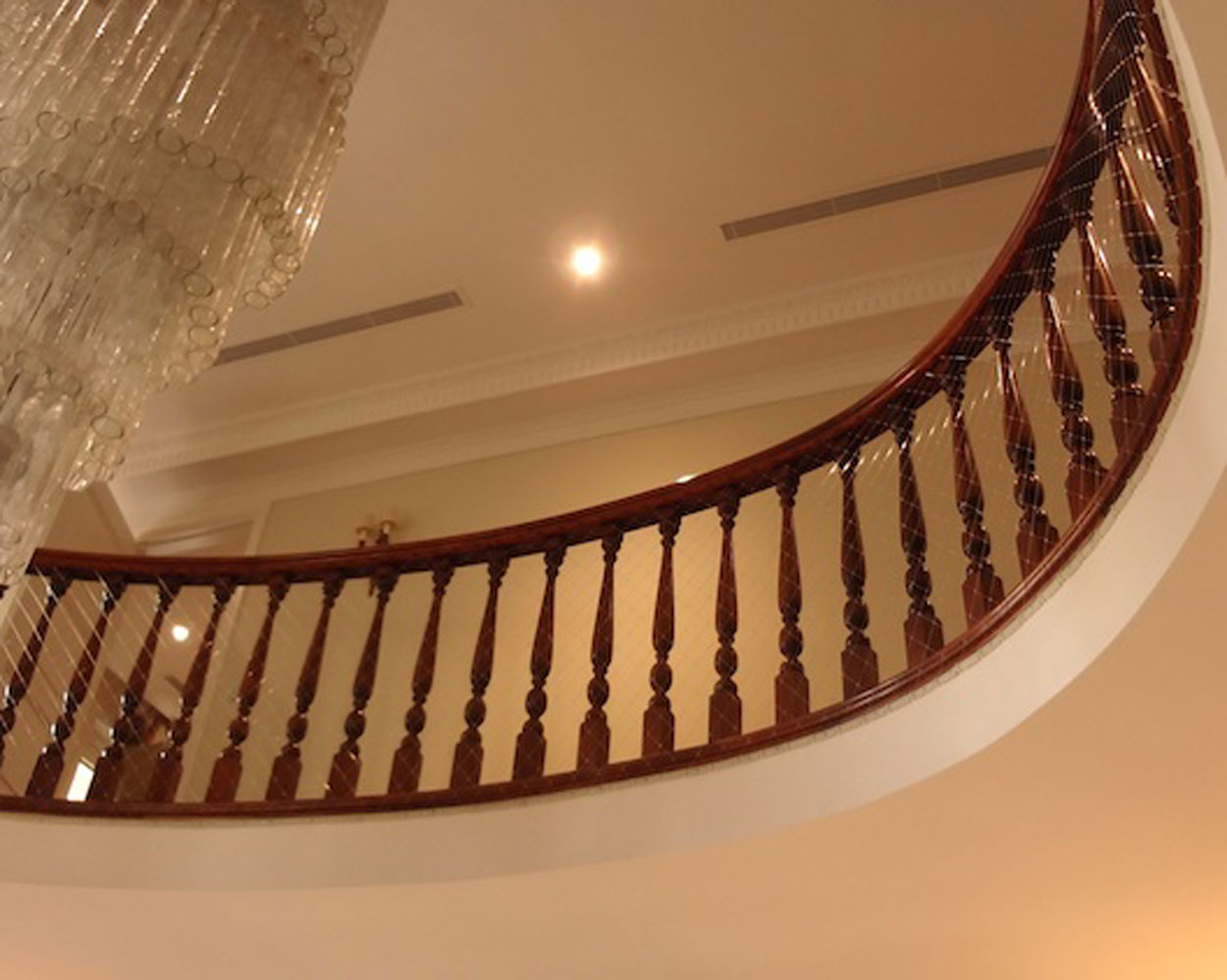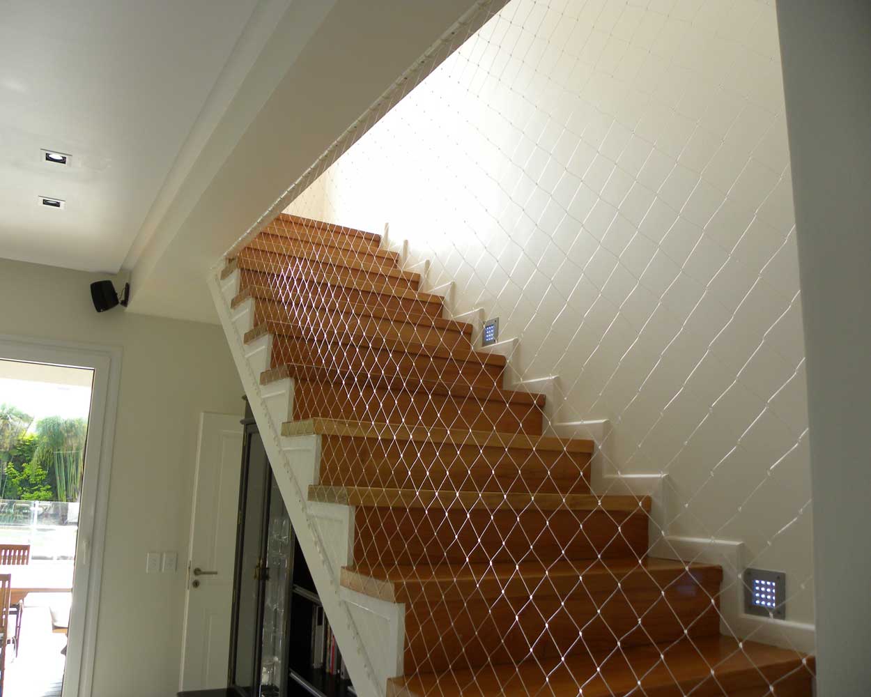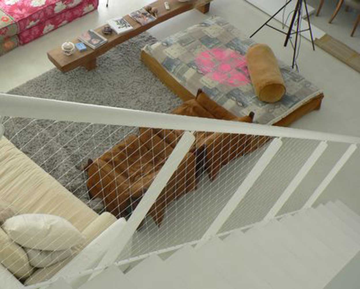 Stopnišča. Nosilne profile lahko pritrdimo na različne načine. Lahko tudi "visijo" v zraku med pritrditvenimi točkami (vsakih 25cm). Na "neobstoječo" stran, od stropa do tal, lahko pritrdimo cev ali plastificirano vrv iz jekla. V primeru, da uporabimo cev, nosilne profile pritrdimo nanjo. Če pa uporabimo jekleno vrv, emrežo obesimo nanjo, brez nosilnih profilov. Pomembno je, da cev oz. sidra, ki držijo vrv, pritrdimo v trdno podlago. Jeklena vrv mora biti dovolj nosilna, debeline vsaj 4-5 mm.